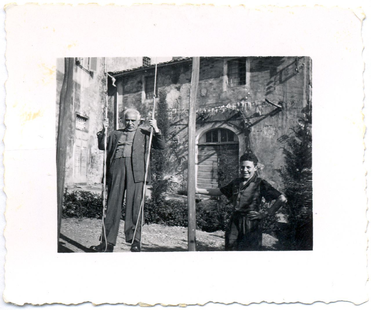 ritratto di coppia maschile - un uomo anziano in piedi su un'altalena e un adolescente, in posa in un cortile - sullo sfondo una cascina con portone