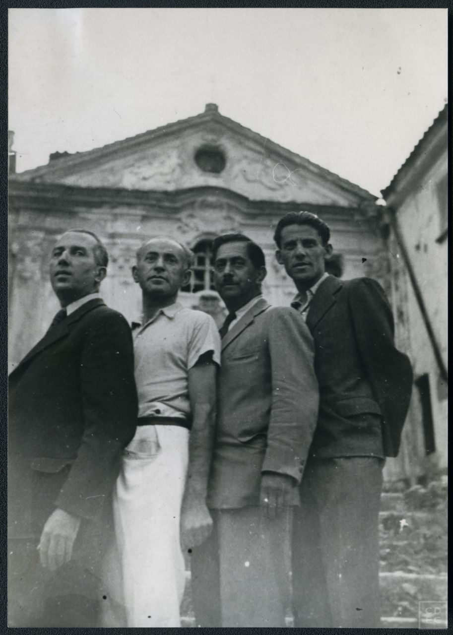 Ritratto di un gruppo di uomini tra cui Leiser (Leo) Schwammenthal e Milan Singer nel campo di internamento di Campagna